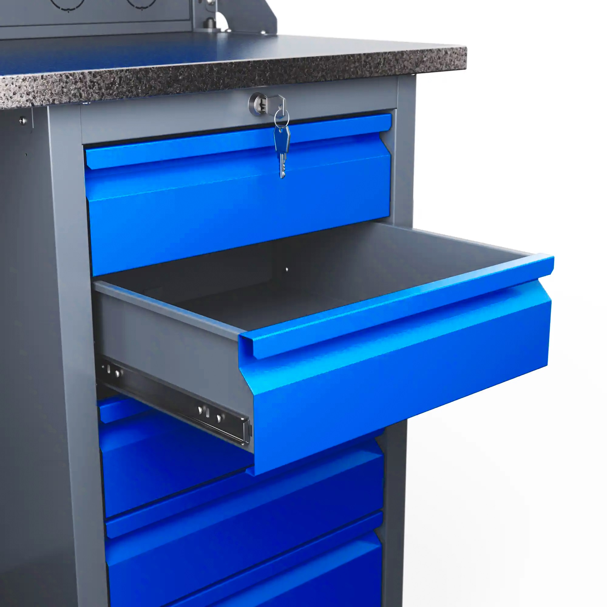 - Элегантное сочетание пыльно-серого и небесно-синего цветов придаёт верстаку привлекательный вид – это весьма существенно при установке в домашней мастерской или учебном заведении.