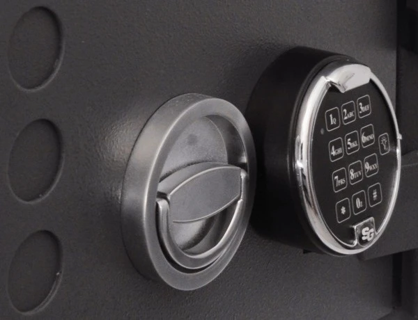 - Клавиатура замка отстоит от двери на 39 мм. Поворотная ручка в виде полукольца, будучи сложенной, выступает на 12 мм. Эти отступы в заданных размерах сейфа не учитываются.